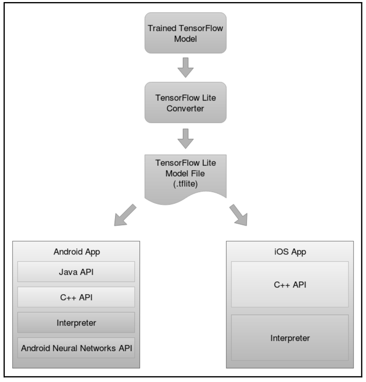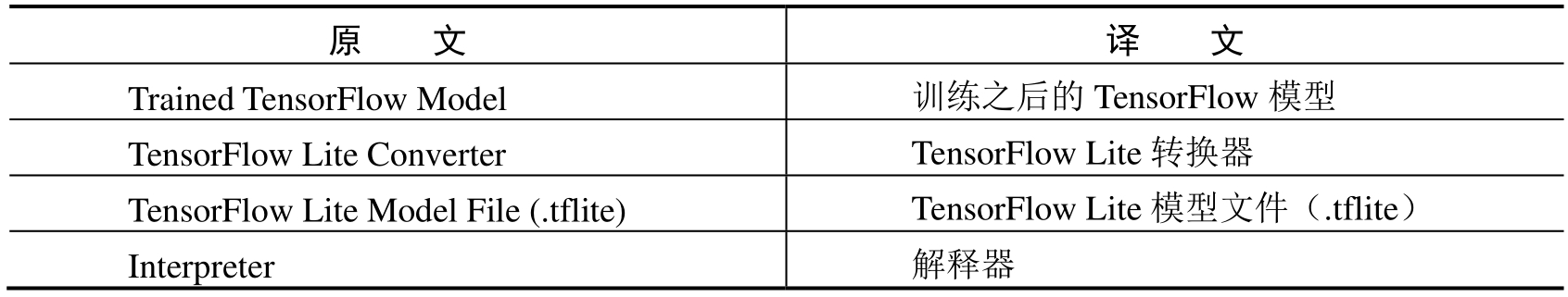 从图1-6中可以看到,我们需要将训练之后的TensorFlow模型转换为TensorFlow Lite模型,然后才能在移动设备上使用它。这很重要,因为TensorFlow模型比TensorFlow Lite模型更大,延迟也更长,TensorFlow Lite模型经过优化后才能在移动设备上运行。这种转换是通过TensorFlow Lite转换器进行的,转换器可通过以下方式使用。