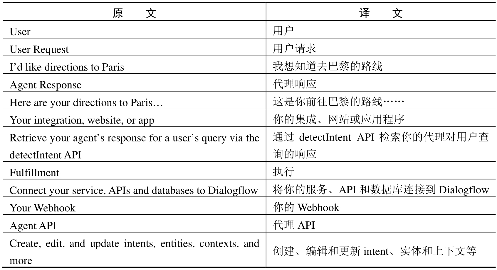代理(agent):我们使用Dialogflow工具开发的聊天机器人即称为代理。聊天机器人生成的响应称为代理响应。