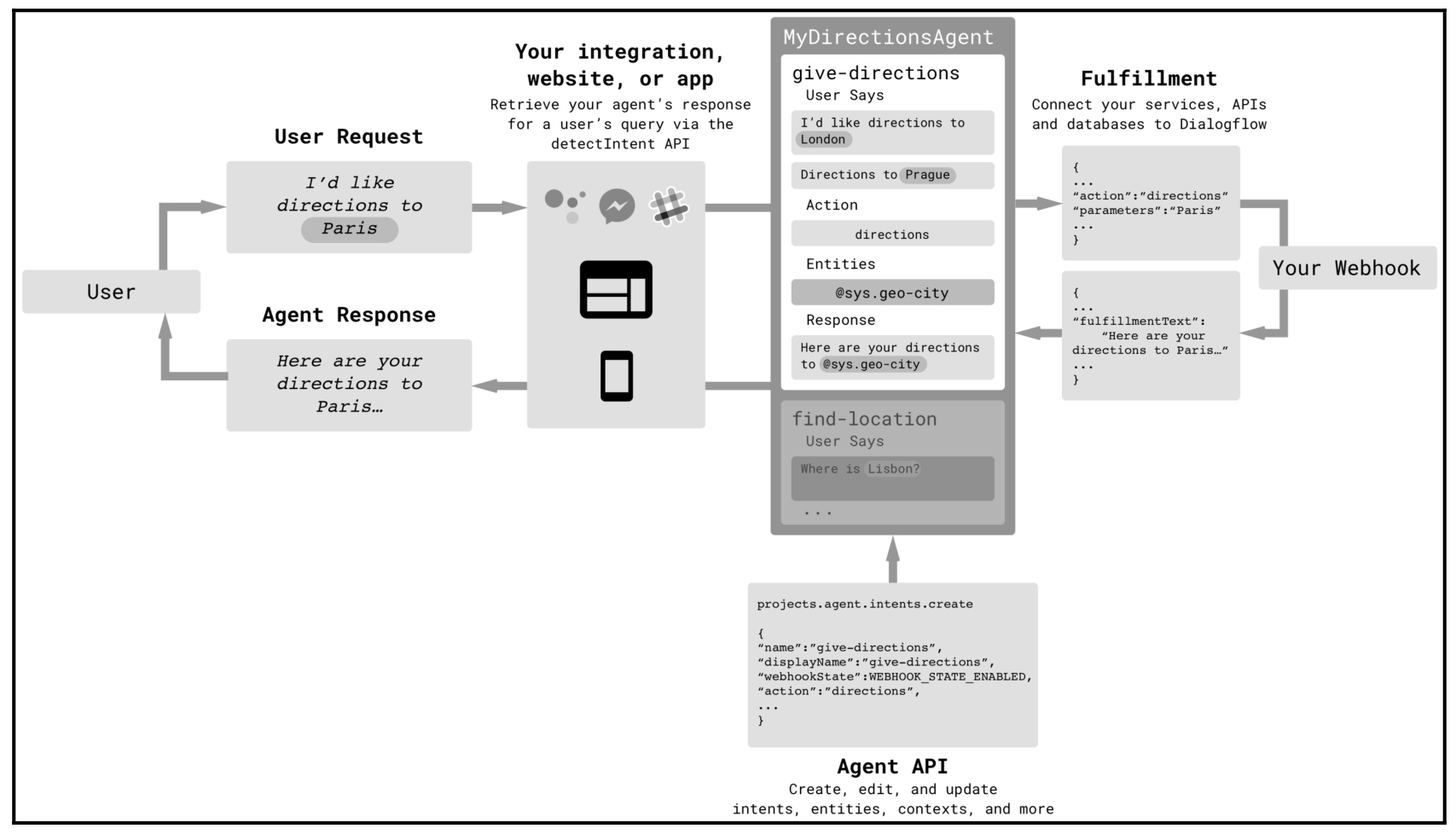 集成(integration):这里的集成是一个软件组件,负责将用户请求传递给聊天机器人逻辑并将代理响应(Agent Response)传递给用户。这种集成可以是你创建的应用程序或网站,也可以是Slack、Facebook Messenger等现有服务,或者只是调用Dialogflow聊天机器人的脚本。