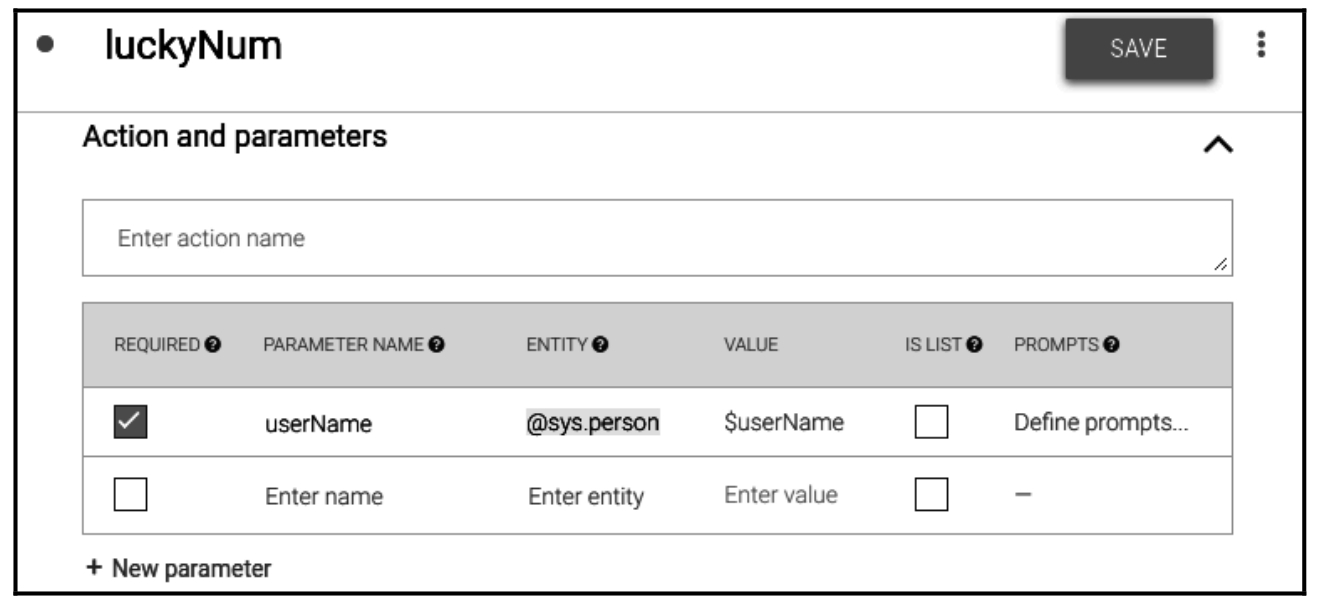 现在我们将创建一个Intent,从用户那里获取输入并确定用户的姓名。然后,Intent将提取用户名称的值并将其存储在实体中,该实体稍后将传递给Webhook进行处理。
