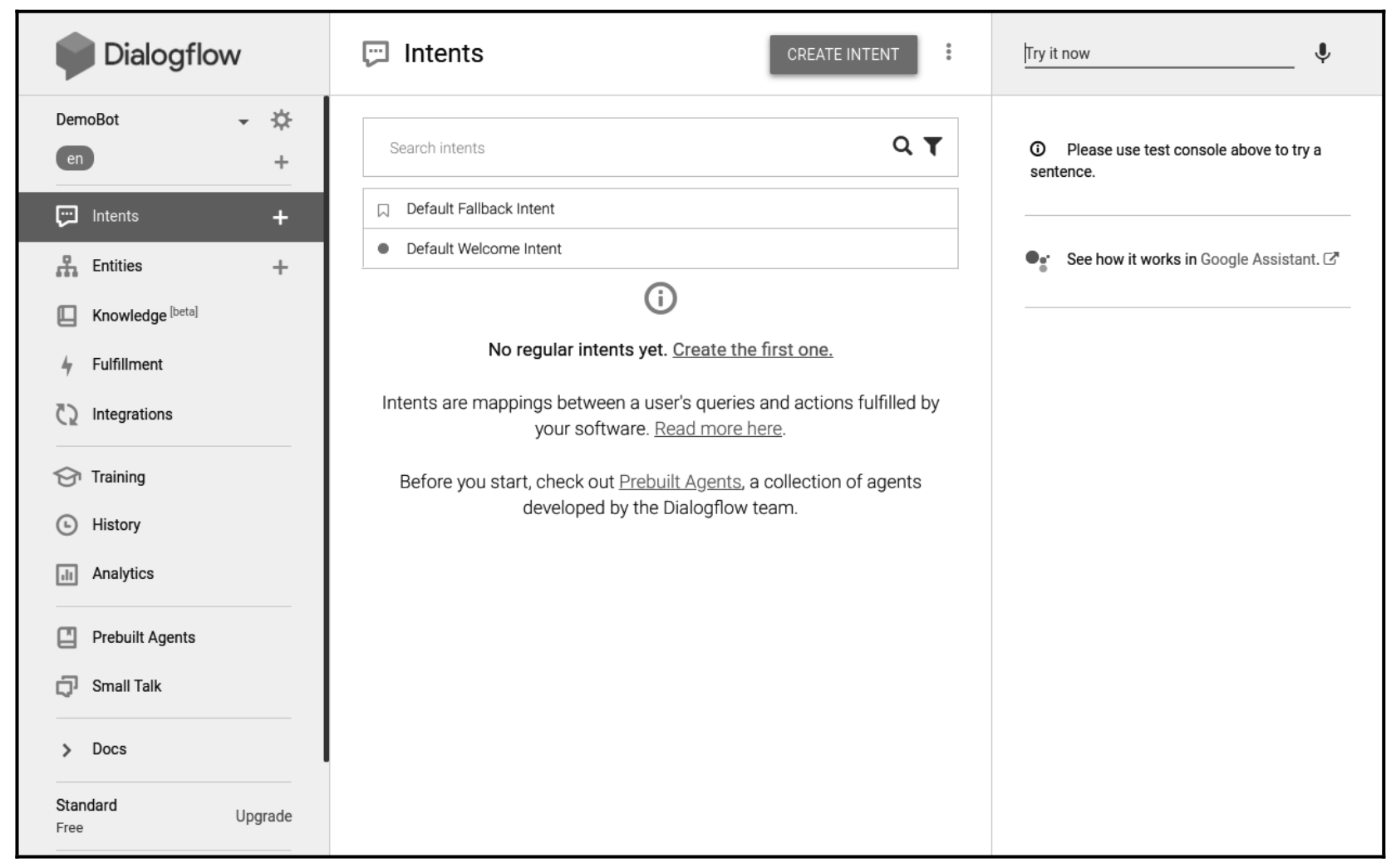 Dialogflow控制台是用于管理聊天机器人、Intent、实体以及Dialogflow提供的所有其他功能的图形用户界面。