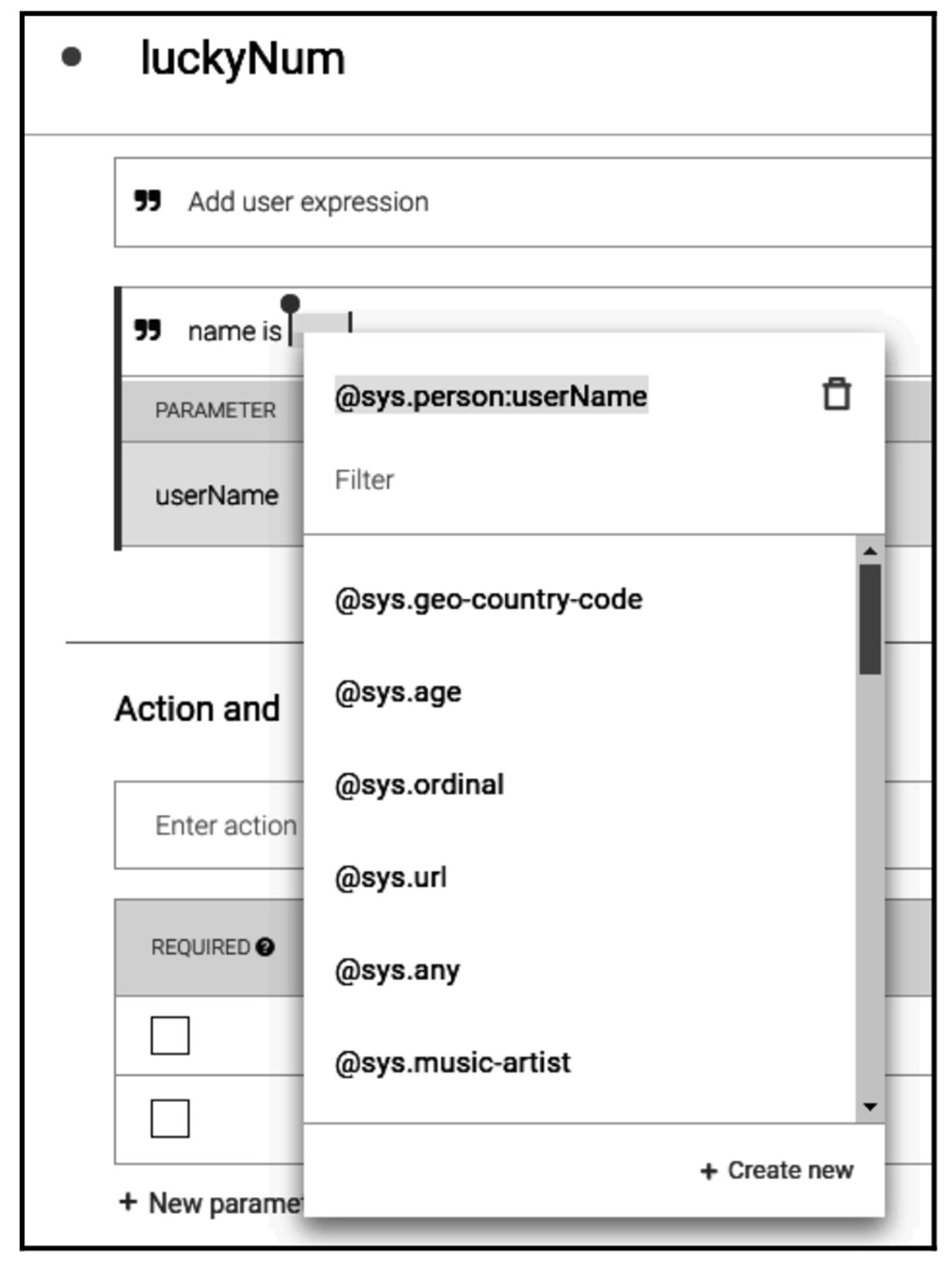 (3)抓取所需的实体并选择单词John。此时将出现一个下拉列表,该列表将该单词与任何预定义的实体相匹配。我们将使用@sys.person实体来获取名称并将其存储为userName参数,如图3-5所示。