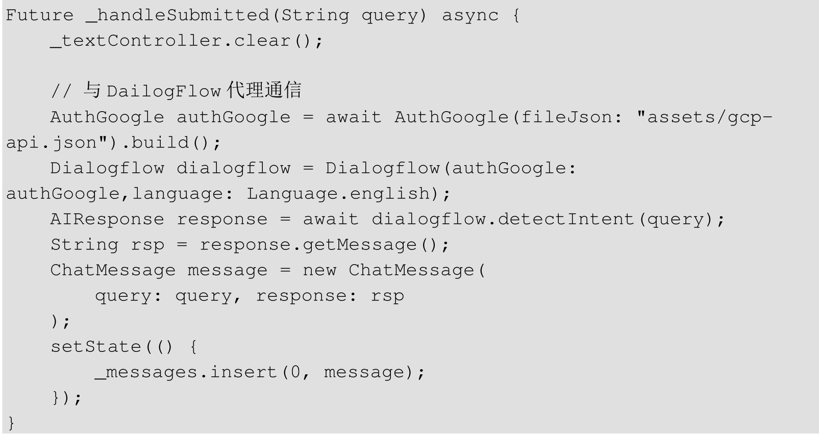 (1)为了在应用程序中集成Dialogflow,可使用名为flutter_dialogflow的Flutter插件。