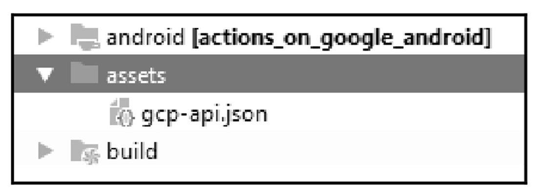 (3)添加包含GCP凭据的gcp-api.json文件。这是你在项目控制台上创建Dialogflow代理时下载的。为此,需要创建一个assets文件夹并将gcp-api.json文件放入其中,如图3-16所示。