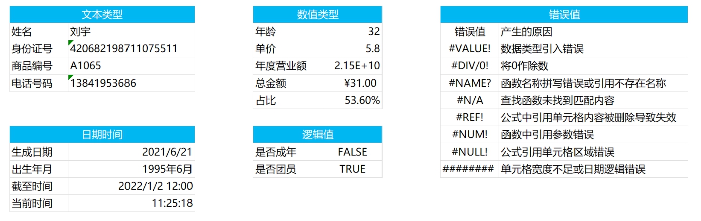 数据类型是数据的一个属性,Excel中也有数据类型的明确概念,将数据类型分为五大类,即文本、数值、日期时间、逻辑值和错误值,如图1-14所示。