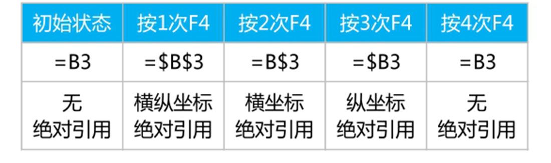 切换引用类型的方式有两种,第一种是直接输入,在“编辑栏”中找到单元格地址,在需要的行号或列标前添加“$”(英文模式下,按Shift+4键)。第二种方式是通过F4键快速切换,选中“编辑栏”中的单元格地址按F4键,按第一下F4键是添加绝对引用,按第二下切换至只对行号添加绝对引用,按第三下切换至只对列标添加绝对引用,按第四下切换回相对引用,以此循环,如图1-13所示。对比两种方式,F4键可快速切换模式,效率更高。