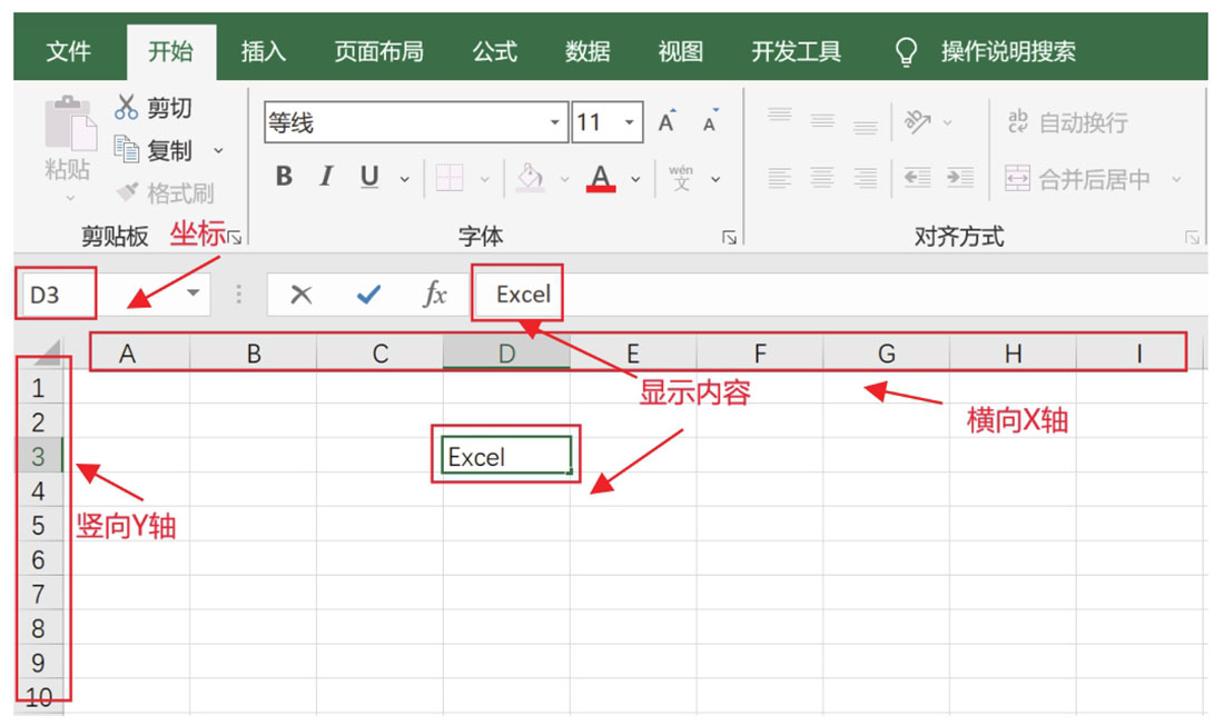 在介绍三种引用方式前首先看一下Excel是如何记录一个单元格内容的,每一个工作表纵向都会有一列数值,横向会有一行字母,它们的作用是标记单元格的地址信息,如图1-10所示。选中“Excel”字符串所在的单元格,在左上角位置坐标显示为“D3”,表示该单元格处于D列第3行,在编辑栏和单元格显示“Excel”即内容是“Excel”。