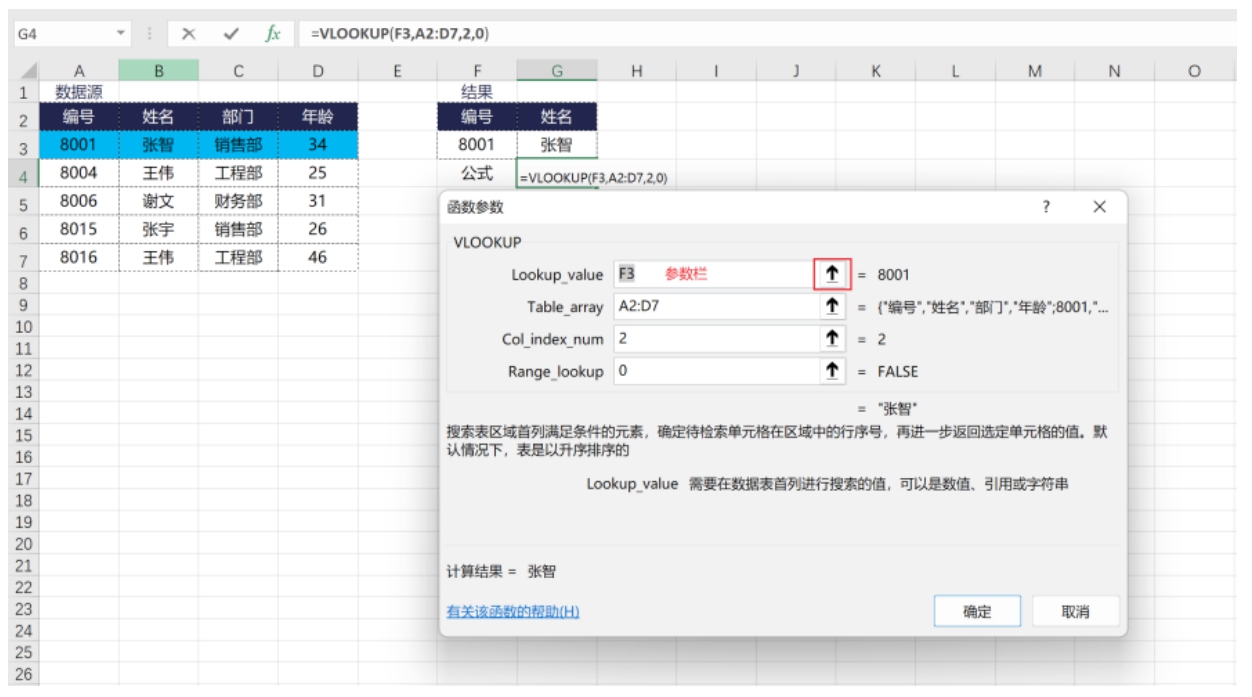 在“函数参数”对话框内添加参数的方式有两种。第一种是直接输入单元格地址,在图1-9中,VLOOKUP函数的第一个参数的单元格地址是“F3”,可直接在参数栏,即“Lookup_value”框中输入“F3”,也可单击参数栏右侧的向上的黑色箭头按钮选中F3单元格,这时窗口的内容也会变成F3单元格的地址。
