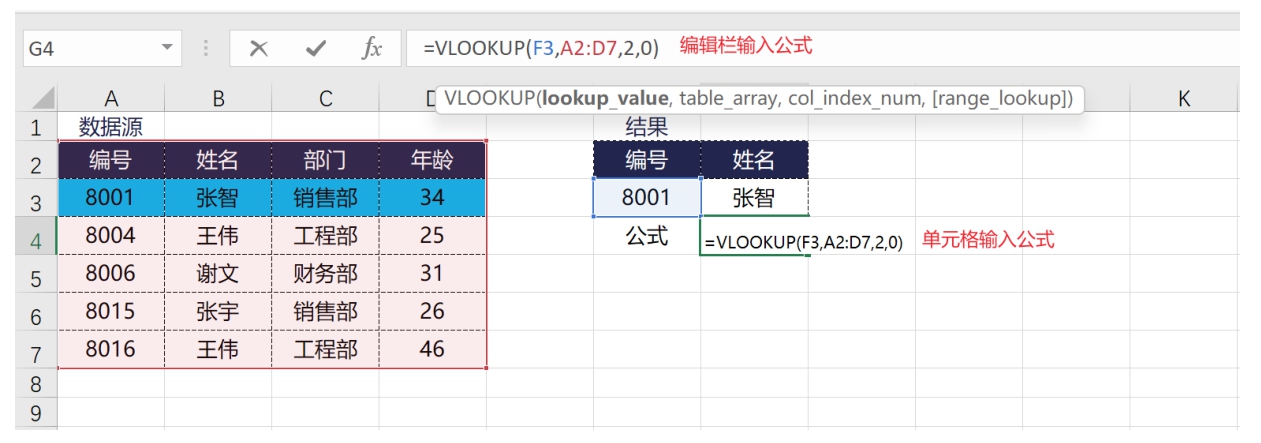 相比于窗口可视化插入参数的方式,在编辑栏和单元格内直接输入公式更加快速,输入函数前几位的字母时就会出现联想框,提示你可能需要的函数,例如我们想输入VLOOKUP函数,只要输入“VL”两个字母,就可联想出VLOOKUP函数,且可以熟悉函数的参数组成,加深对函数的印象,有利于函数的学习。