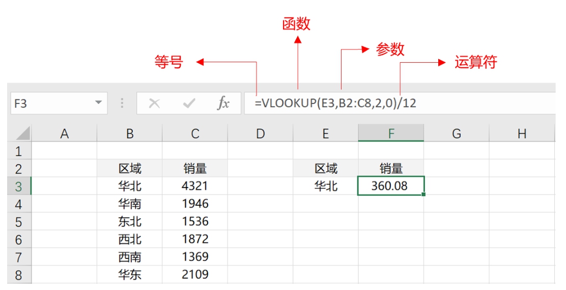 函数是Excel公式最基本的组成元素,此外还有等号、函数参数以及运算符,如图1-5所示。