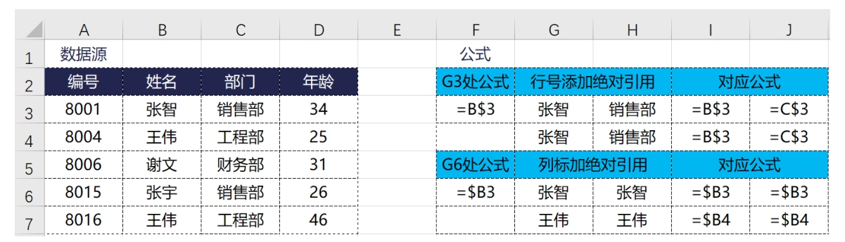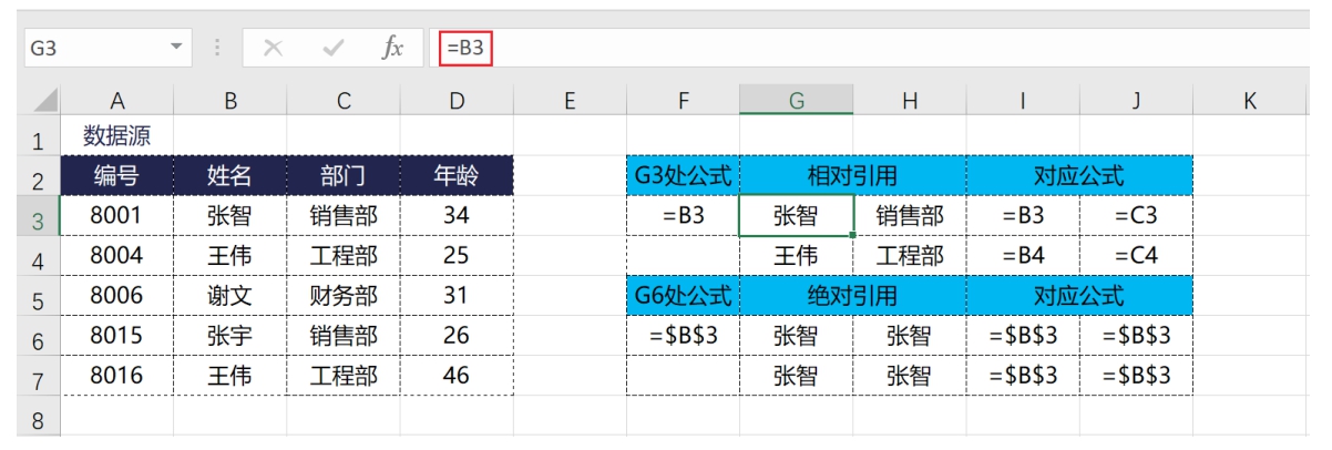 如图1-12所示,在G3单元格的公式内对行号添加绝对引用,公式为“=B$3”,内容为“张智”。将单元格公式向右侧拖动,行号在使用相对引用时也不改变,只改变列标,H3单元格公式为“=C$3”,内容为“销售部”,所以向右拖动公式时行号使用绝对引用和相对引用效果都是一样的。向下拖动时,列标不发生变化,如果使用相对引用行号会增大,添加绝对引用后无论下拉多少个单元格都是3,所以公式“=B$3”下拉至G4单元格还是“=B$3”,单元格位置和内容都不变化。将公式复制至H4单元格,相对引用下列标和行号都会增大,而这里因为行号使用绝对引用保持不变,公式为“=C$3”,内容为“销售部”与上方的H3单元格一致。