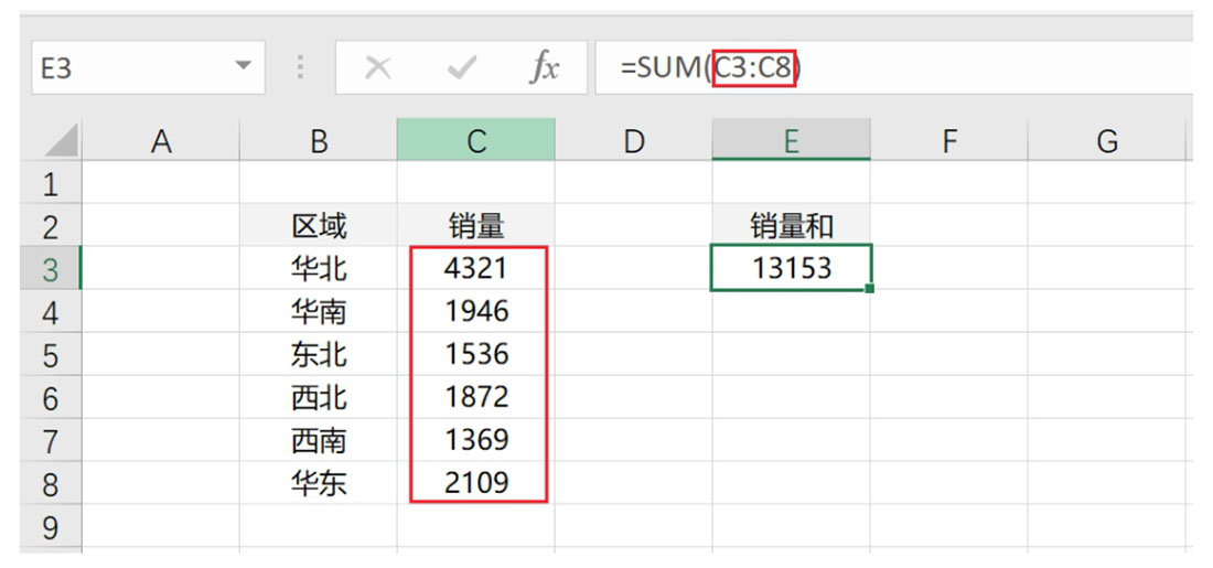 (4)引用运算符:是Excel特有的运算符,主要作用是对工作表的单元格或单元格区域引用,如区域运算符:(冒号),冒号两端两个单元格形成的连续矩形区域,如图1-6所示。