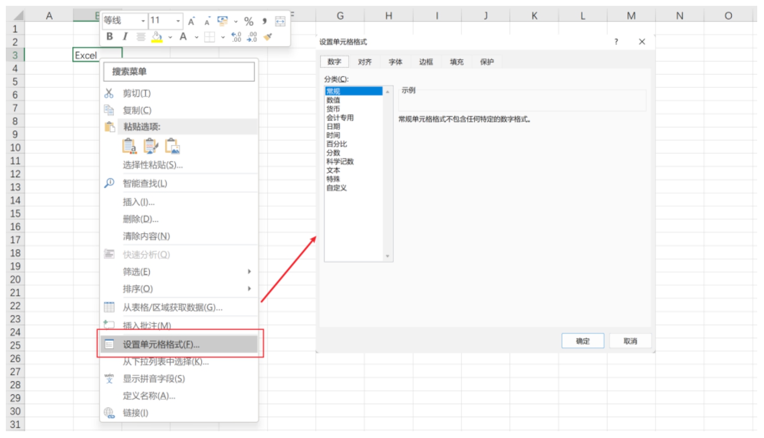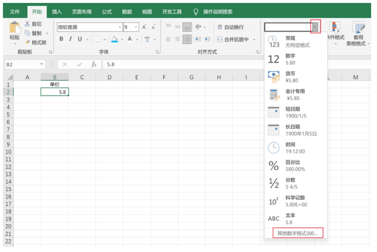 如图1-16所示,单击数据所在单元格,单击功能区中的“开始”选项卡,在“数字”组中的下拉列表可以设置当前数据的数据类型,选择单元格内的数据类型为数值型。切换数据类型的另一种方法是右键单击数据所在单元格,在快捷菜单中选择“设置单元格格式”选项,单击“数字”选项卡,在“分类”组中选择适合的数据类型,单击“确定”按钮即完成切换,如图1-17所示。