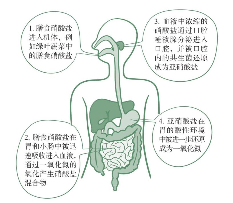 简单来说,这条途径就是:食用蔬菜后,蔬菜中的天然膳食硝酸盐就进入了我们身体的循环系统。硝酸盐首先到达胃部和小肠,然后被吸收进入血液循环。这时候我们机体的血浆硝酸盐浓度会升高,大部分(约65%)的硝酸盐会随着尿液被排出体外;还有大约25%的硝酸盐会被输送到唾液腺,并在唾液中浓缩,这些硝酸盐被口腔中的共生细菌还原成亚硝酸盐,再次沿着我们的消化道到达胃部,在胃部的酸性环境下,亚硝酸盐被还原为一氧化氮(NO)。
