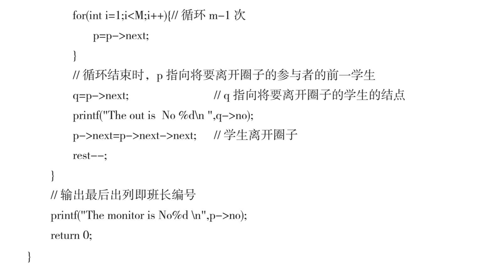 【例2.6】1200101 班每个学生都有学号,分别是1,2,3,...,n,所有同学按学号顺序围坐一圈,从第1 开始数,每数到第m个,该同学就要离开此圈,这样依次下来,直到圈中只剩下最后一位同学,则该同学就为班长。