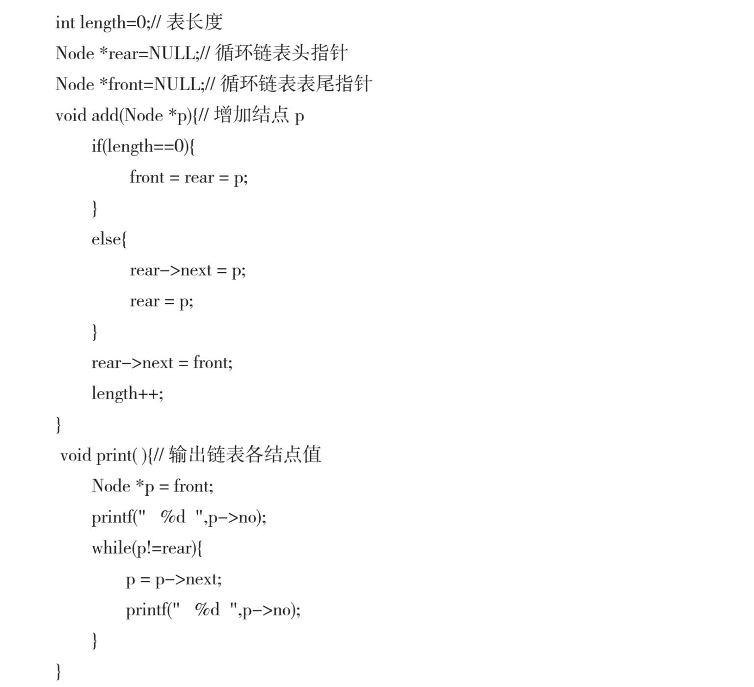 再实现循环链表,为了方便测试,循环链表中同时实现了增加结点和输出链表各结点编号,具体代码如下: