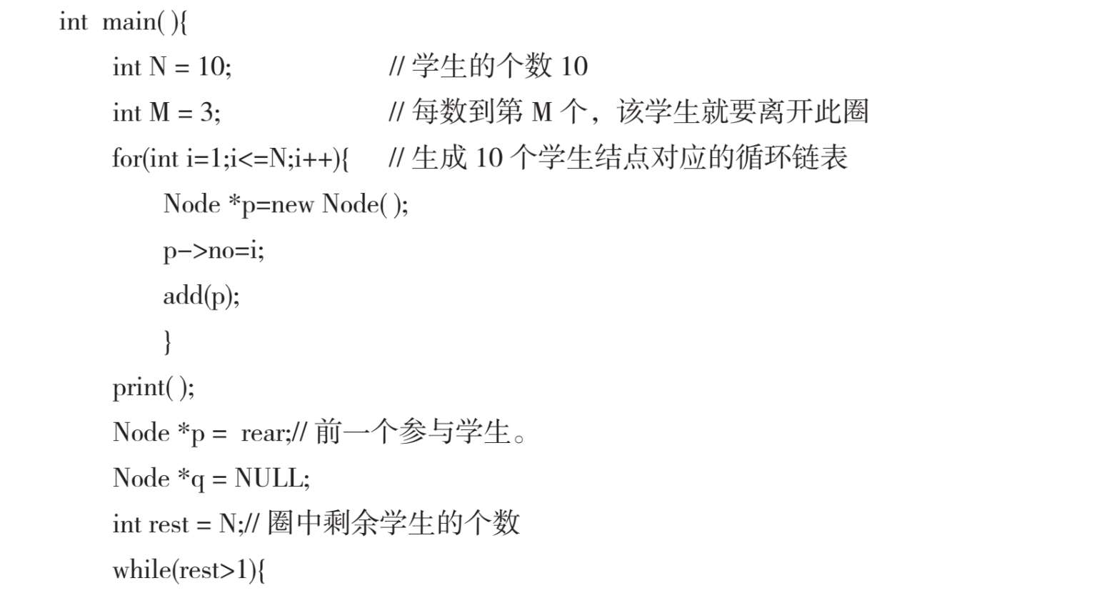 算法思想:使用单循环链表数据结构模拟问题,每个结点是一位同学,结点的值域为该同学的学号,总共n个结点。遇到出列的结点则删除该结点。如此循环,直到只剩下最后一个结点为止。最后输出该结点的学号。