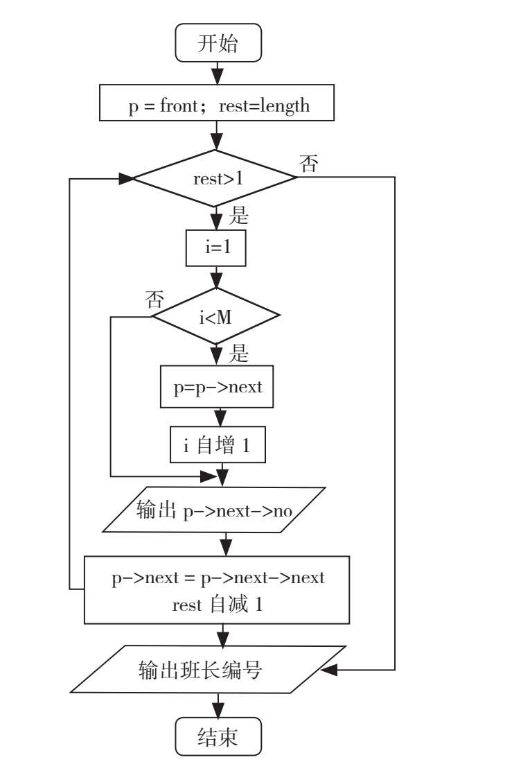 从循环链表中选择一个数据元素为班长,其中front为循环链表头指针,rear为循环链表表尾指针,length为链表的长度,rest为圈中剩余同学的个数,M为数到第M个,该同学结点就被删除,则选取流程图如图2.20所示。