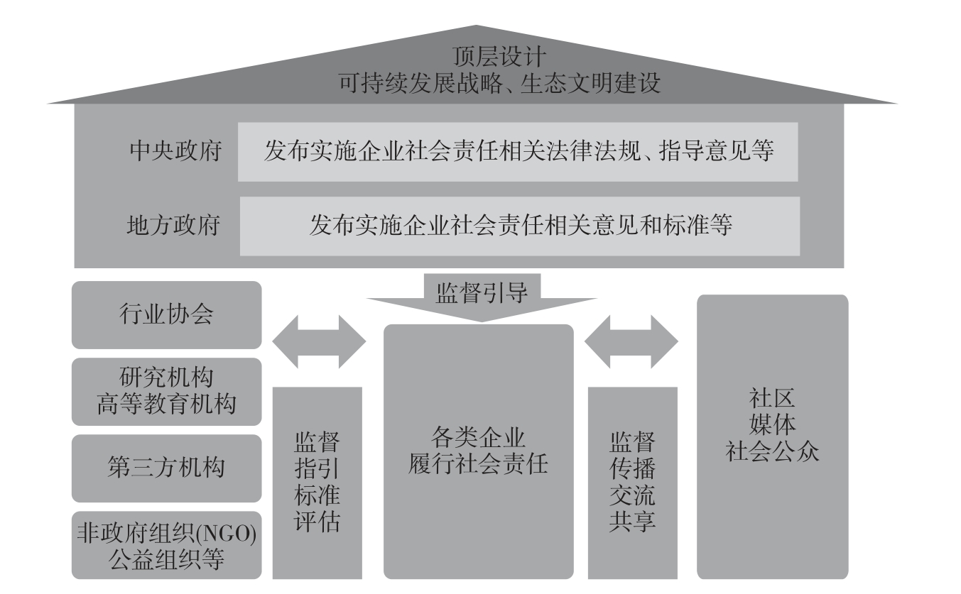 政府层面上,国务院国资委出台政策文件,在引领央企践行社会责任中发挥排头兵、领头羊的作用。继2008年发布《关于中央企业履行社会责任的指导意见》(被称为央企社会责任“1号文”),使社会责任成为央企“必修课”之后,2011年,国务院国资委又在《中央企业“十二五”和谐发展战略实施纲要》中提出,央企要推进与社会责任相关的“五个建设”。2013年,党的第十八届中央委员会第三次全体会议通过《中共中央关于全面深化改革若干重大问题的决定》,将承担社会责任作为深化国企改革的重点之一。为规范企业履行社会责任行为,国家出台了一系列指导性文件,还在2013年召开了中央企业社会责任工作会议,为中央企业社会责任工作指明了方向。此外,2019年,国务院印发的《关于营造更好发展环境支持民营企业改革发展的意见》将民营企业也纳入履行社会责任的主体中。在地方层面,河南、河北、山东等多地政府也积极发布相关指导性文件。