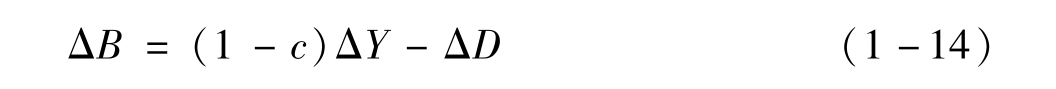 式(1-14)表明,贬值将对三方面造成影响:实际收入水平Δ Y 、国内吸收水平Δ D 以及边际吸收倾向 c (每增加一单位国民收入用于吸收的百分比)。