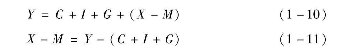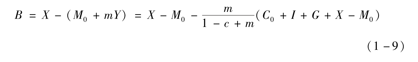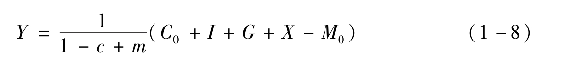 其中, c 表示边际消费倾向, m 表示边际进口倾向, C 0 表示自主性消费, I 表示居民投资, G 表示政府购买, M 0 表示自主性进口。在不考虑国际资本流动的前提下,根据式(1-8)我们可以得到: