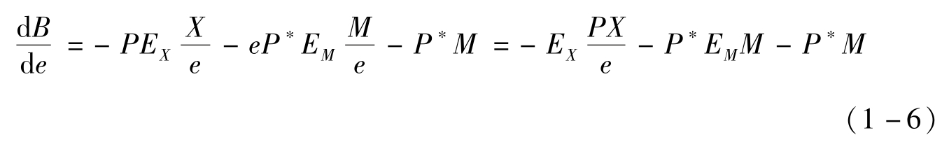 国际收支差额(贸易差额) B 可以表示为: B=PX-eP * M ,初始时国际收支平衡即 PX=eP * M 。故: