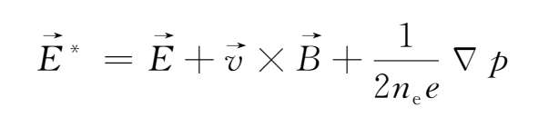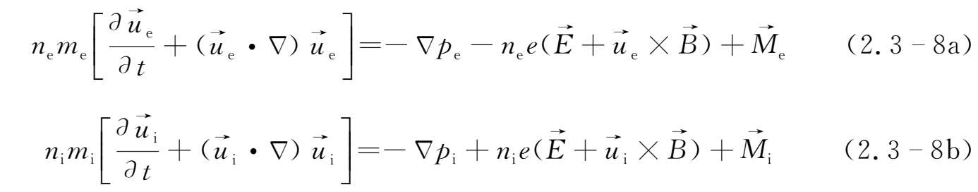 然而,对于那些远未达到热力学平衡的完全电离等离子体,必须分别考虑各种成分气体的运动及它们之间的耦合。下面讨论完全电离等离子体情况下,即它由电子气和离子气两种成分组成,由二流体模型来导出完全电离等离子体中联系电流密度和其他量之间关系的表达式。