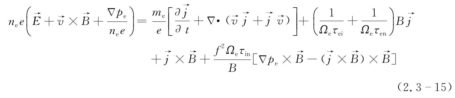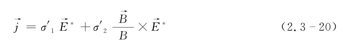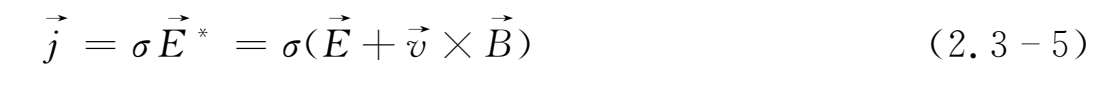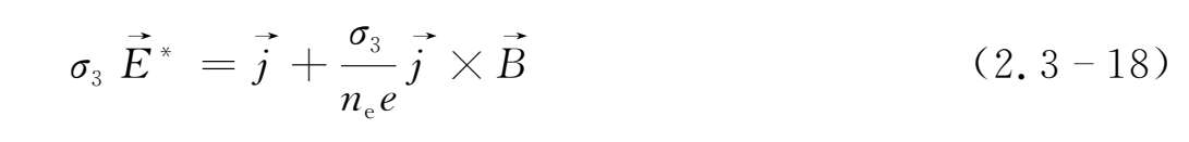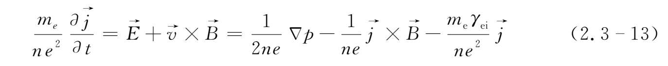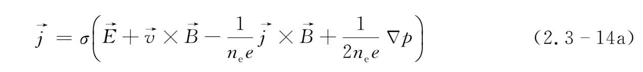 (2.3-13)式就是所谓的广义欧姆定律。(2.3-13)式右方各项分别对应洛伦兹力、热压力、霍尔电动力和电阻效应的贡献。由此可见,在最一般的情况下,等离子体中的电流不仅与等离子体本身的物理性质(如电导率)和电场强度有关,还取决于被研究问题的力学特征(如速度、压力等)和磁场强度的大小。在稳态