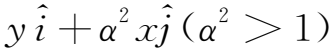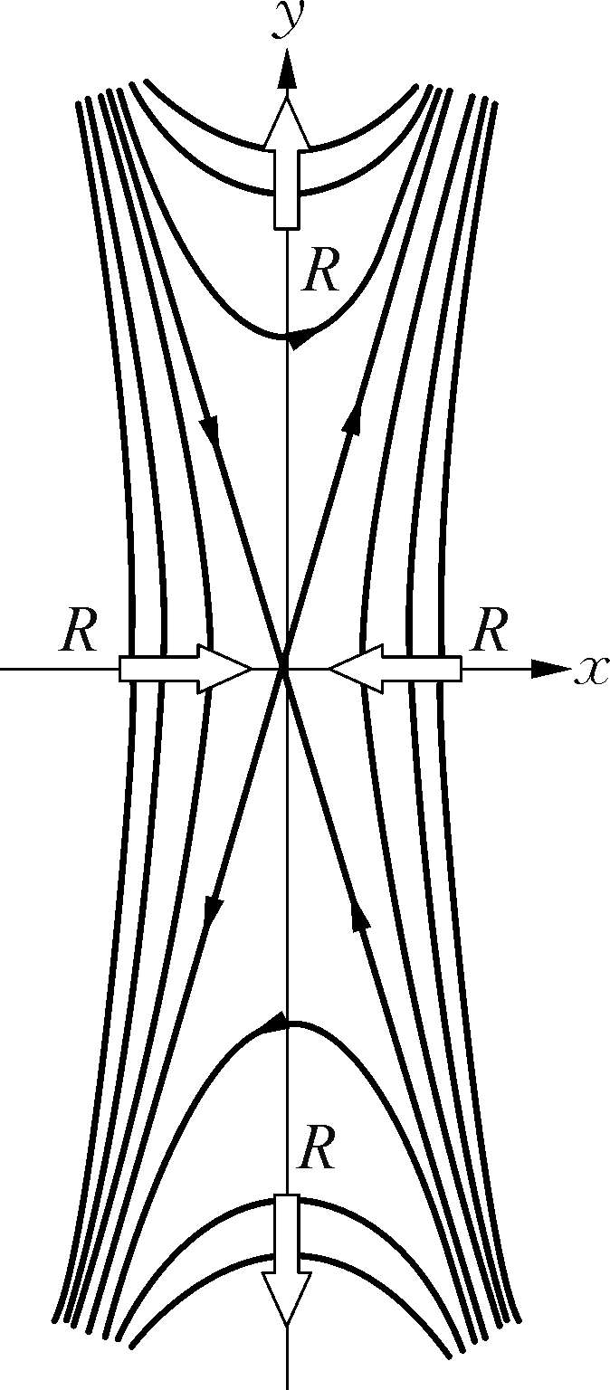 =c如图2.12所示。渐近线y=±αx,此时不再正交。显然在x轴上,较之图2.11磁力线的间距变密,又磁力线的弯曲度变小,所以所受磁压力增强,向外的磁张力变弱,总的合力R在x轴为向原点的磁压力。在y方向上,磁压力不变,而磁张力由于此时磁力线更弯曲而增强,所以在y轴方向,总的合力R是向外的,如图2.12所示。