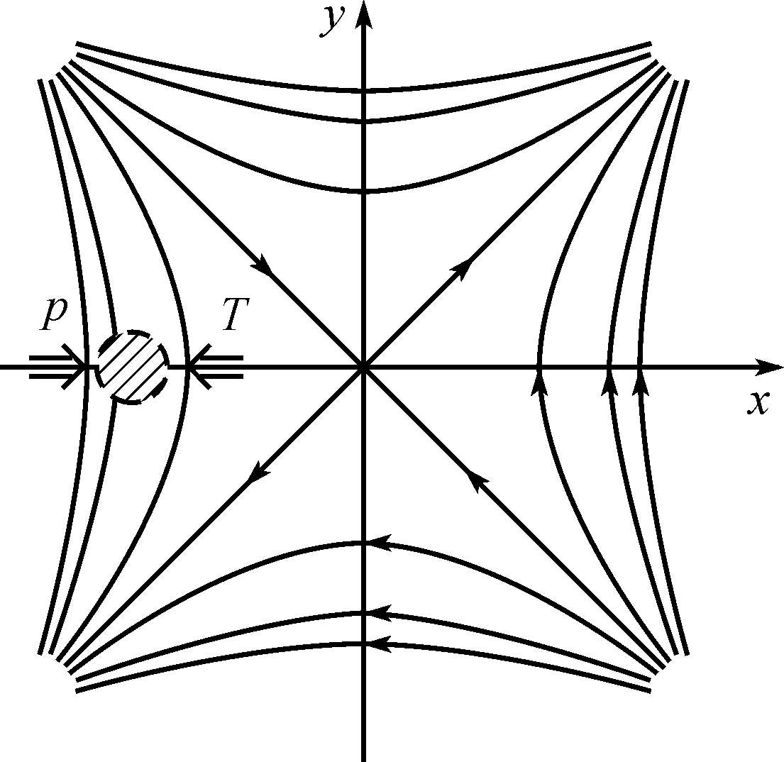 如图2.11所示,相交渐近线y=±x互为直角,原点叫作X型中性点。在该磁场位形中的任意的等离子体元如图中阴影部分所示,所受的洛伦兹力为零,此时所受的张力T与所受的磁压力总效应相消。