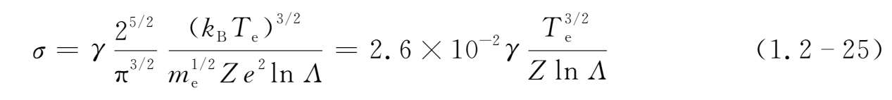 在完全电离等离子体中,碰撞主要发生在带电粒子之间。由于库仑力是长程力,这里主要将不是二体而是多体碰撞。研究表明,在等离子体中大角度偏转主要由多次远碰撞积累而成,并已求出了一个试探粒子为了积累出90°偏转角需要在等离子体内走过的“有效自由程”和碰撞的“有效截面”。如果把τ ei 改成计及远碰撞的“有效碰撞时间”,公式(1.2-20)式仍适用。斯皮策(Spitzer,1962)给出了完全电离等离子体中的电导率公式: