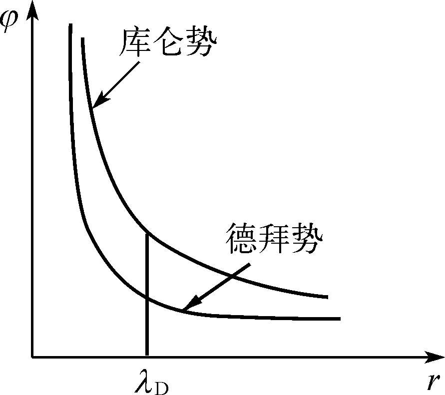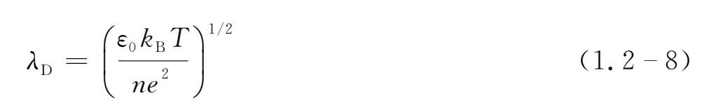 这个结果说明,在等离子体中,一个带电粒子的静电作用被其周围过剩的异号电荷所屏蔽,基本上不超过以德拜长度为半径的球(德拜球)的范围。这个“球”内过剩的异号电荷与中心电荷基本抵消,使中心电荷的作用不能到达球外。所以德拜长度的物理意义有两方面:一方面,它是静电作用的屏蔽半径;另一方面,它又是热运动导致电荷分离的空间尺度。在德拜长度量级的范围内,正负电荷密度可以出现差别。由(1.2-8)式可知,当粒子密度增加时,德拜长度变短,而当温度升高时,长度变长。所以德拜长度反映了热运动(它使气体趋向非电中性)和粒子密度(它借助于静电力使气体趋向电中性)之间的某种协调作用。