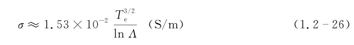 的依赖关系不允许用欧姆加热使之加热到高温(例如热核温度)。在温度高于1 keV时,等离子体已变成良导体,以至在此范围,欧姆加热是一个非常缓慢的过程。由方程(1.2-26)式,我们又看到,电导率σ与密度几乎无关(除了库仑对数lnΛ对密度的弱依赖性外)。这是一个相当意外的结果,它意味着当电场