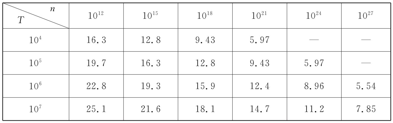 时的瞄准距离。在宇宙等离子体中lnΛ大多在5~20之间,它与温度和密度有弱相关性,如表1.1所示。这里,Z是离子电荷数,下面给出有关氢的结果,有时称作斯皮策电导率。取Z等于1,由于对质子质量M的依赖是弱的,故其他气体也能用这些值,有
