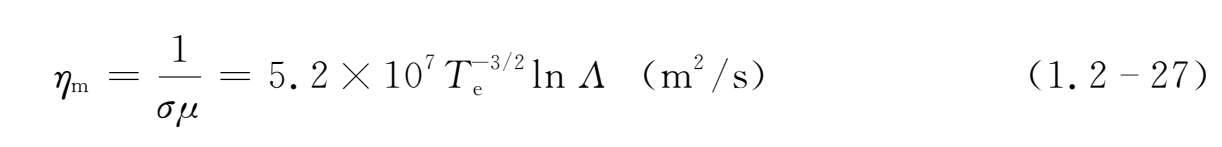 上式中μ为磁导率。由式(1.2-26)式可见,电导率σ随温度的上升迅速地上升。处于热核温度(几万电子伏)的等离子体基本上是无碰撞的。加热等离子体的一种简便途径是使用电流通过等离子体,于是