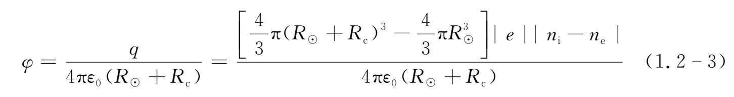 下面再举一例日冕中等离子体的电中性情况。由观测得到,在距太阳圆面R c =10 8 ~10 9 m(日冕区)处的电子密度为n e =10 14 /m 3 ,它的电势不超过3×10 10 V ,计算半径为R ☉ +R c (R ☉ 为太阳半径)的球体内的电荷在该球面上所引起的电势为