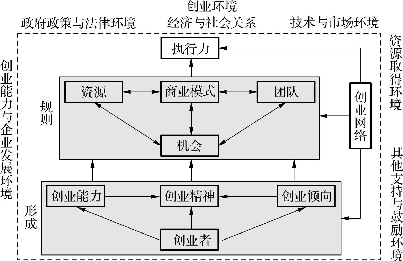 。刘常勇于2002年提出一个较为详细的创业模型,模型分内外两层,内层又由上下两部分组成,由创业者、资源、团队、机会、商业模式、创业网络、创业执行力和创业环境等要素构成,如图3-6。该模型认为创业者是创业活动启动的基础,创业机会、资源、商业模式和创业团队是创业活动的核心要素;创业网络贯穿创业的全过程,是连接创业环境与创业过程的主要桥梁,创业过程离不开创业环境的影响