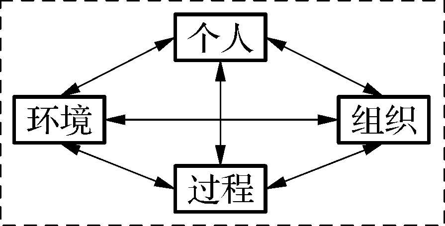 。Gartner于1985年从创业过程复杂性出发提出了新创企业的创业模型,其理论模型主要由个人、环境、组织和过程等4个关键要素构成,4个要素又包含50个以上变量;4个关键因素相互影响,构成了网状结构,如图3-1