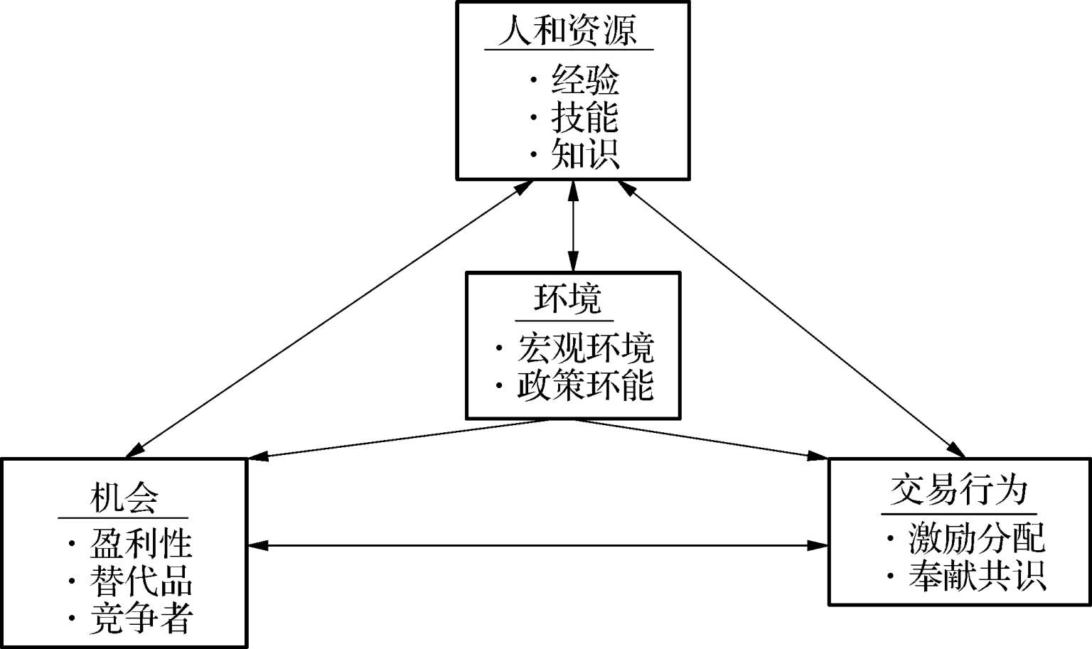 。Sahlman于1996年从组织行为学的角度提出了其创业模型,其模型包括人和资源、机会、交易行为和环境等关键要素,如图3-5。Sahlman认为创业过程是上述要素相互作用的结果,该模型一方面突出了要素之间的适应性和匹配度;另一方面拓展了要素的外延,强调了创业环境和交易行为的重要性,交易行为因素是该模型的最大特点