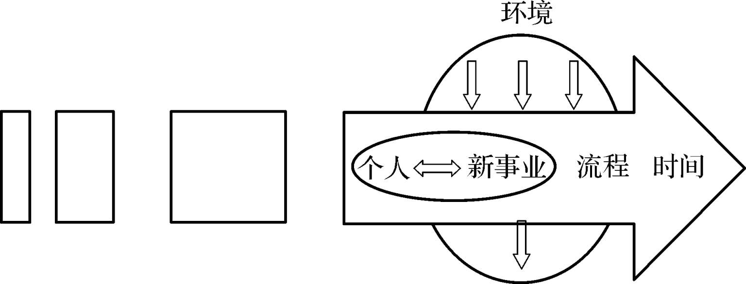 。借鉴Timmons模型的思路,Christian在2000年基于创业者与新事业之间的互动关系,提出了自己的创业模型,其创业模型包括个人即创业者、新事业、流程、时间和外部环境等5个要素,其中创业者与新事业是2个核心要素,如图3-3。Christian模型主要强调创业者与新事业的互动关系,与Timmons模型一样重视创业者的功能,并认为创业者的能力是可以通过创业教育和管理实践进行培养的