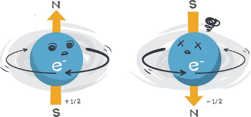 当把电子放置在一个磁场中时,它的自旋取向可以与磁力线的方向相同或相反,这导致出现了“上旋”或“下旋”的取向,分别由量子数+1/2和-1/2 来描述。