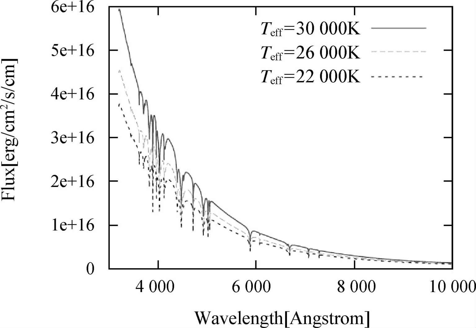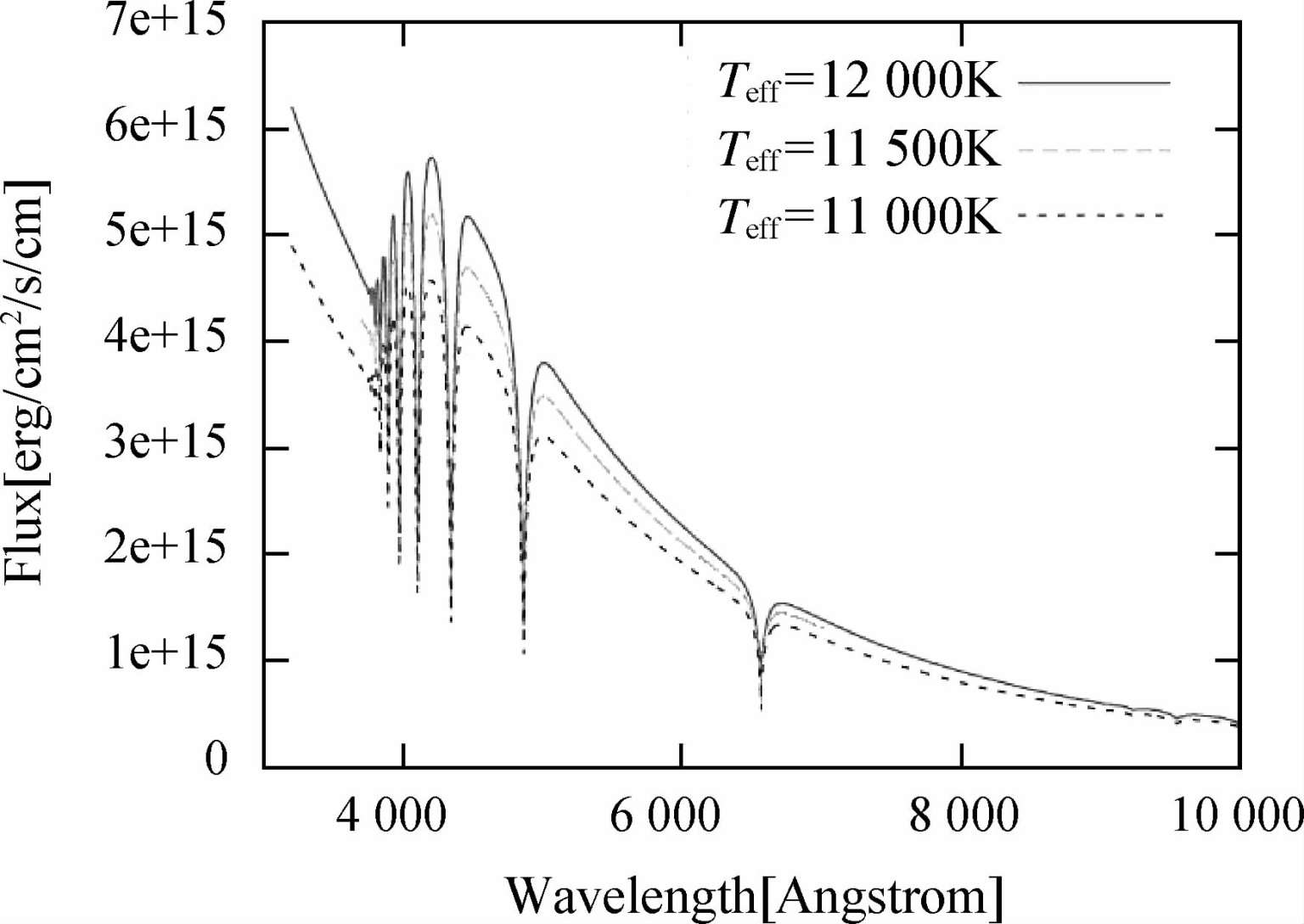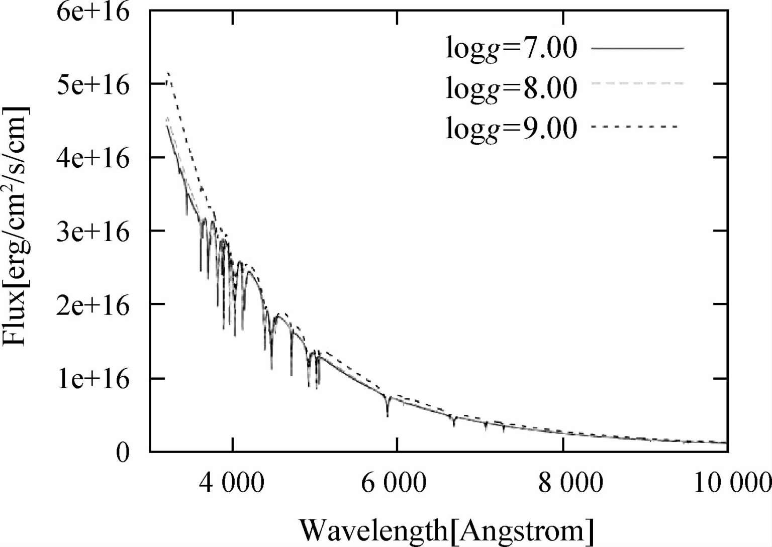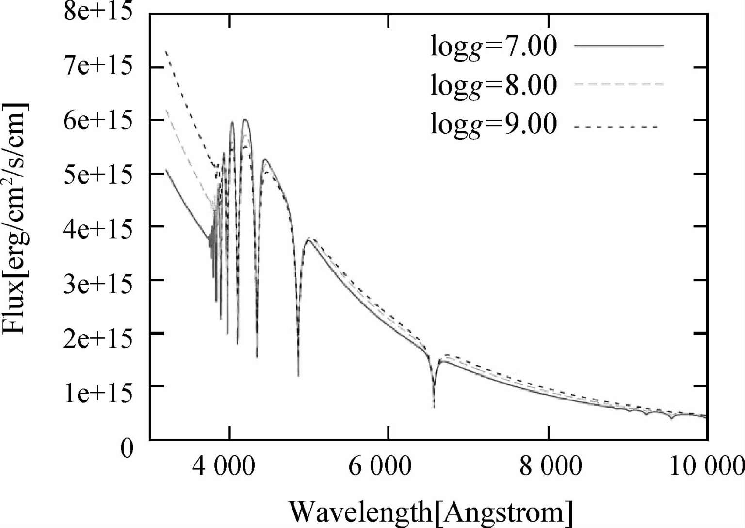 理论模型给出的天体光谱对模型拟合至关重要。Koester在2008年的工作 [26] 中,在均匀平面平行层、流体静力学平衡、辐射和对流平衡、局部热力学平衡等基本假设前提条件下,考虑基本粒子的束缚-自由吸收、自由-自由吸收、束缚-自由跃迁、汤姆逊散射、瑞利散射等物理过程,计算了白矮星光谱和大气模型。图2.5为Koester的光谱库中有效温度为26 000K时不同重力加速度的DB型白矮星理论光谱展示图。图2.6为Koester的光谱库中重力加速度log g =8.00时不同有效温度的DB型白矮星理论光谱展示图。图2.7为Koester的光谱库中有效温度为12 000K时不同重力加速度的DA型白矮星理论光谱展示图。图2.8为Koester的光谱库中重力加速度log g =8.00时不同有效温度的DA型白矮星理论光谱展示图。从四幅图中可以看出,不同有效温度和重力加速度数值会对DB和DA型脉动白矮星光谱产生显著影响。另外,图2.5和图2.6给出的DB型白矮星理论光谱图和SDSS给出的观测获得光谱(图2.2)整体形状很相似。图2.7和图2.8给出的DA型白矮星理论光谱图和SDSS给出的观测获得光谱(图2.1)整体形状很相似。光谱库中有效温度的步长为500K,重力加速度log g 的步长为0.25。通过插值计算可以获得更小步长的具有不同有效温度和不同重力加速度的网格白矮星光谱图,用于对观测光谱进行拟合工作。