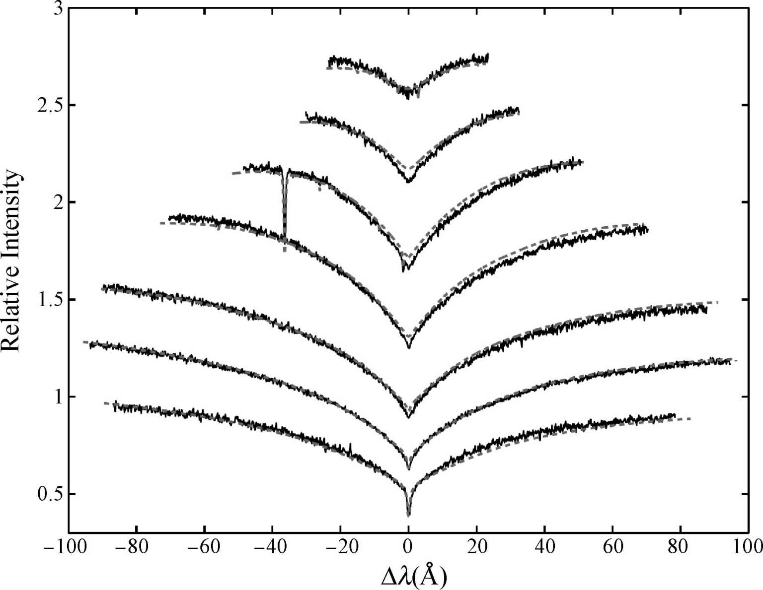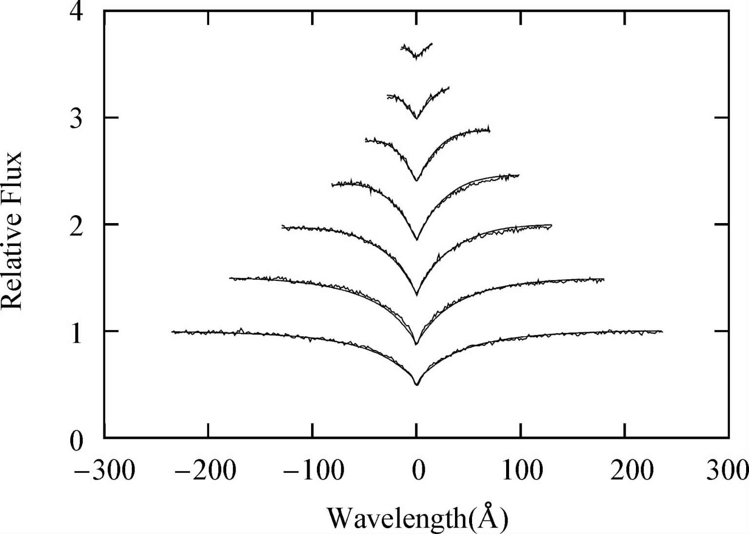 图2.9和2.10展示的是使用Koester的模型光谱库 [26] 对图2.1中DA型脉动白矮星GD 154观测光谱的初步拟合工作 [27] 。筛选的最佳拟合模型参数为 T eff =11 400K,log g =8.20[CGS]。图2.9是在3 820埃到6 800埃波长范围内的归一化拟合 [27] 。图2.10是把巴尔末吸收线(H α 到H η )取出逐一单独拟合并把拟合结果绘制在同一幅图中 [27] 。粗糙曲线为观测光谱,光滑曲线为模型结果,两幅图中模型曲线较好地拟合了观测曲线。