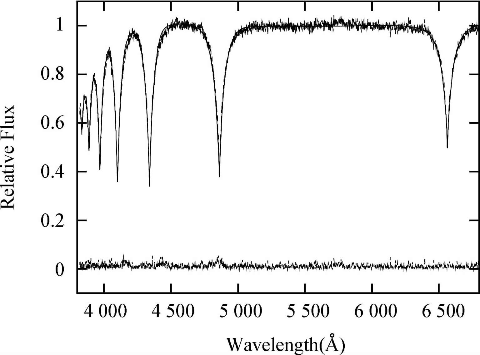 图2.11是Xu等人在2014年的工作 [30] 中对DAV白矮星G 29-38的光谱拟合,最佳拟合模型的拟合参数为 T eff =11 820K,log g =8.40,观测光谱来自欧南台SN Ia Progenitor Survey项目。观测光谱中发现了明显的Ca II K线。这些Ca II K线很可能来自白矮星对周围行星物质的吸积 [30] 。