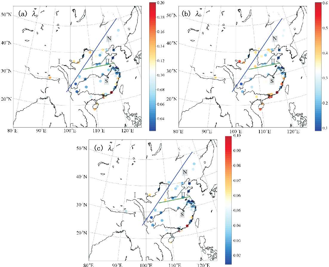 图3.1.2 部分城市形态参数(λ p 、λ b 、λ f )空间分布(蓝线为“胡焕庸线”,绿线为秦岭—淮河线)