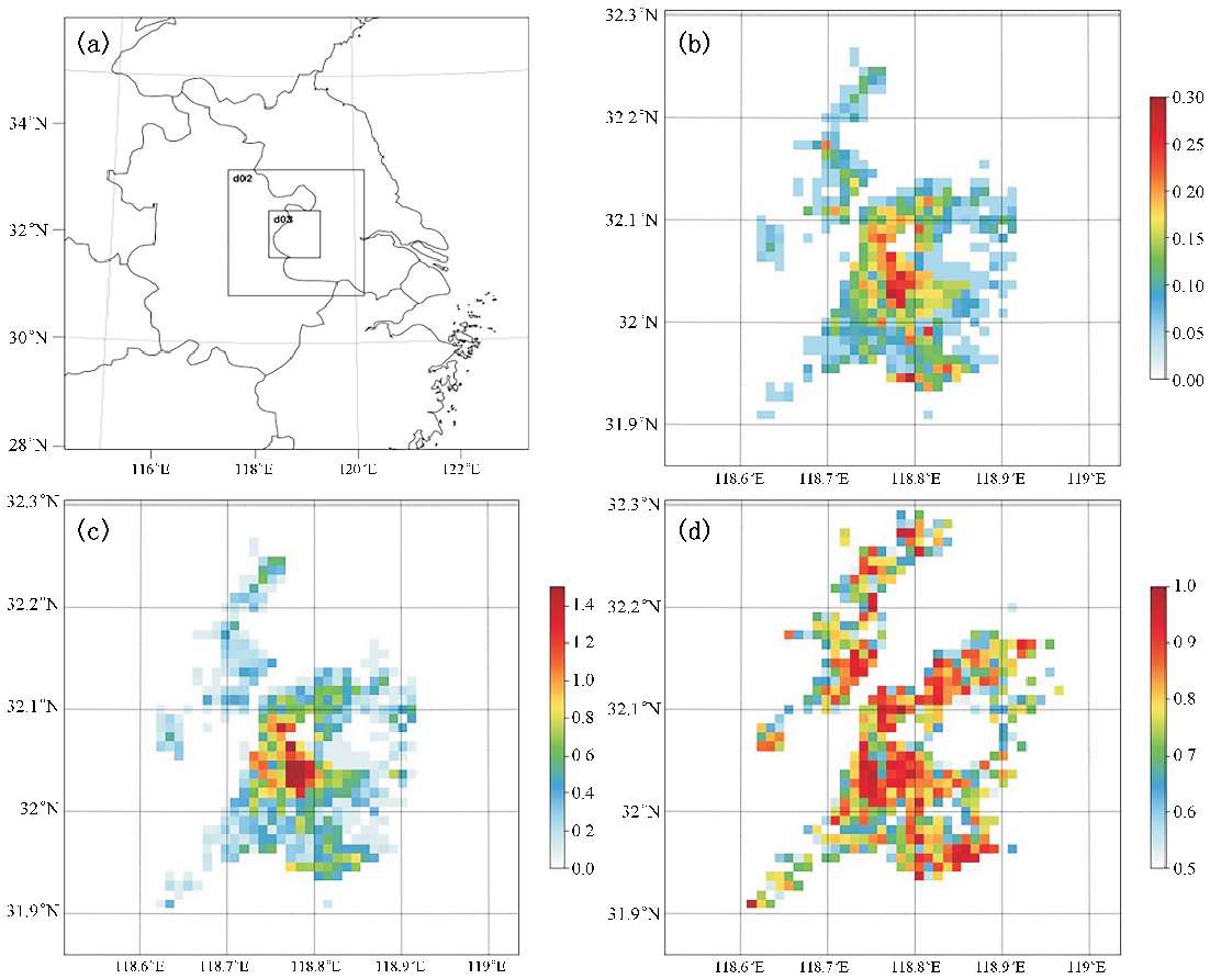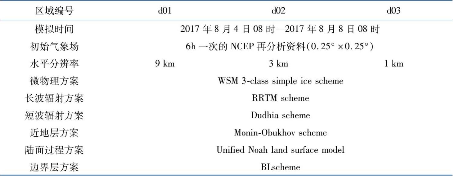 WRF模式中不同城市冠层方案对城市建筑物形态做了不同程度的简化,所需要的城市形态参数也不尽相同,为了探究WRF模式对城市冠层参数的敏感性问题,我们对南京的一次晴天过程进行了模拟。本次模拟采用三重嵌套,模拟区域如图3.1.6 所示,模拟时间为2017年8月4日08时—2017年8月8日08时(北京时,下同),其中前24小时为模拟调整时间。模拟区域中心经纬度为118.8 °E和32.06 °N,水平网格距分别为9,3和1 km。本研究共设计了两组实验:采用WRF默认城市形态参数的Default算例,以及采用高分辨率城市形态参数的UCPs算例(表3.1.3),所有算例除城市冠层方案选择不同,其他参数化方案均相同,表3.1.4给出了模式模拟主要参数设置情况。