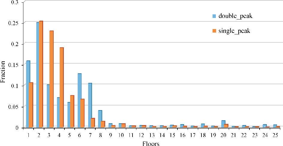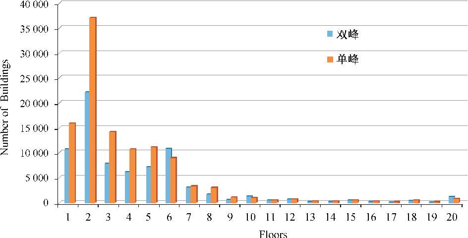 图3.1.4 单双峰形态城市建筑物数量随高度变化统计