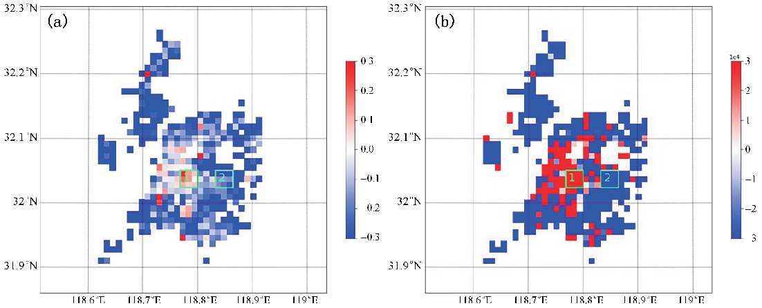 图3.1.8(a)南京平均建筑物归一高度(无量纲量)差值水平分布(UCPs-default);(b)南京建筑全面积差值水平分布(UCPs-default)