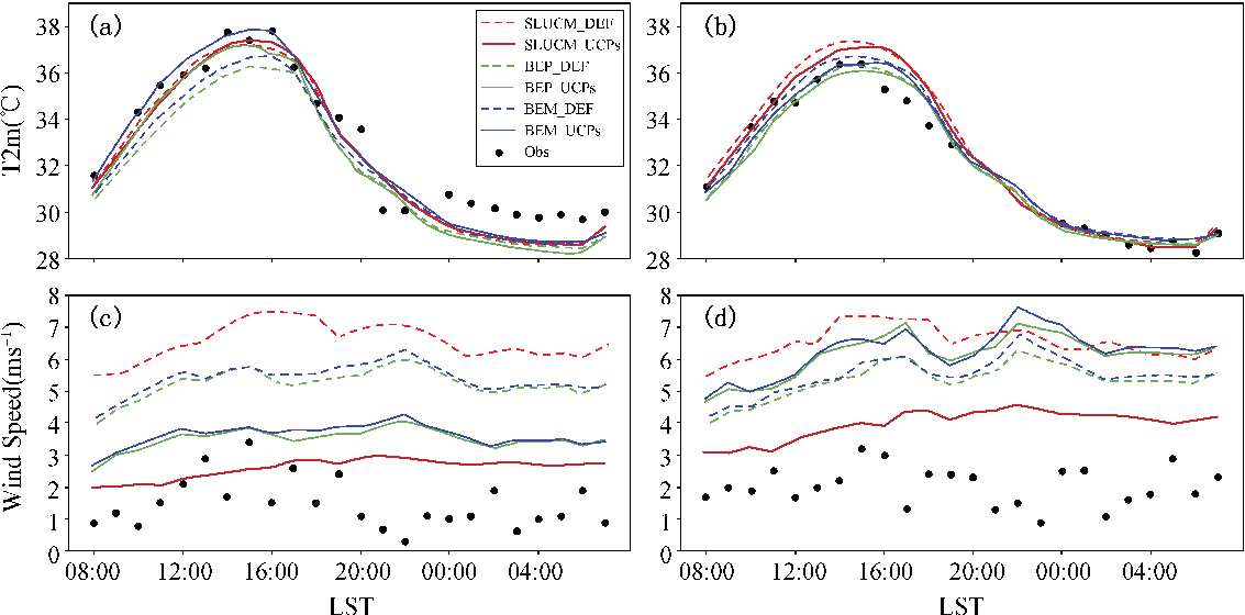 图3.1.9给出了2017年7月31日08时—8月1日08时市中心2 m温度和冠层风速日变化情况,由图3.1.9可见,引入城市形态参数后,WRF对2 m温度和冠层风速的模拟效果有显著提升,WRF对城市形态参数较为敏感。城市形态参数对2 m温度的影响主要体现在白天,而对冠层平均风速的影响则是全天。以区域1 为例,default算例模拟出的2 m温度略低于观测值,特别是BEP_DEF和BEM_DEF方案,对2 m温度的低估更多;引入城市形态参数后,三种城市冠层方案对2 m温度的模拟都有提升,基本与观测值相同,其中BEM_UCPs算例2 m温度模拟值与观测值最为接近。这是因为UCPs算例在区域1 建筑表面积要大于default算例,建筑表面吸收更多的太阳辐射,使城市增温,区域2 则相反,致使UCPs算例模拟出更低的2 m温度。从三种方案2 m温度的模拟效果来看,城市形态参数对多层城市冠层方案2 m温度的模拟效果提升要大于单层城市冠层方案,SLUCM温度对UCPs相对不敏感。从冠层风速来看,SLUCM_UCPs算例对风速的模拟与观测值最为接近,并且城市形态参数对单层城市冠层方案风速模拟提升最大,这可能是因为SLUCM_UCPs直接调用了表征城市建筑迎风面积的迎风面指数,对城市风场的模拟影响最为直接,提升了WRF模式对风速的模拟能力。