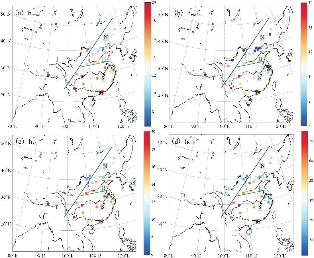 图3.1.1 中国60个城市平均高度、中位数高度、高度均方差、95分位高度空间分布(蓝线为“胡焕庸线”、绿线为秦岭—淮河线,I、II区表示东、西部,S、N表示南、北地区,单位:m)